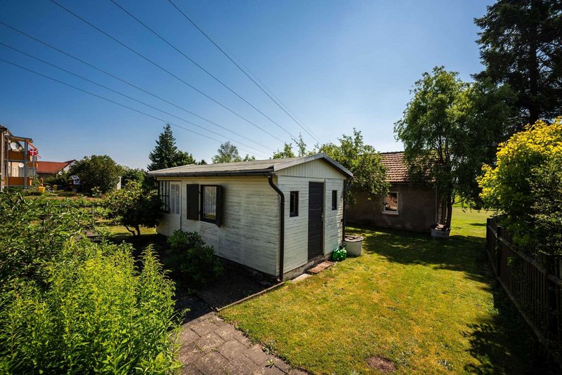Bestehende Bebauung: Vorderes Flurstück mit idyllischem Gartenhäuschen und Garage für Wohnwagen