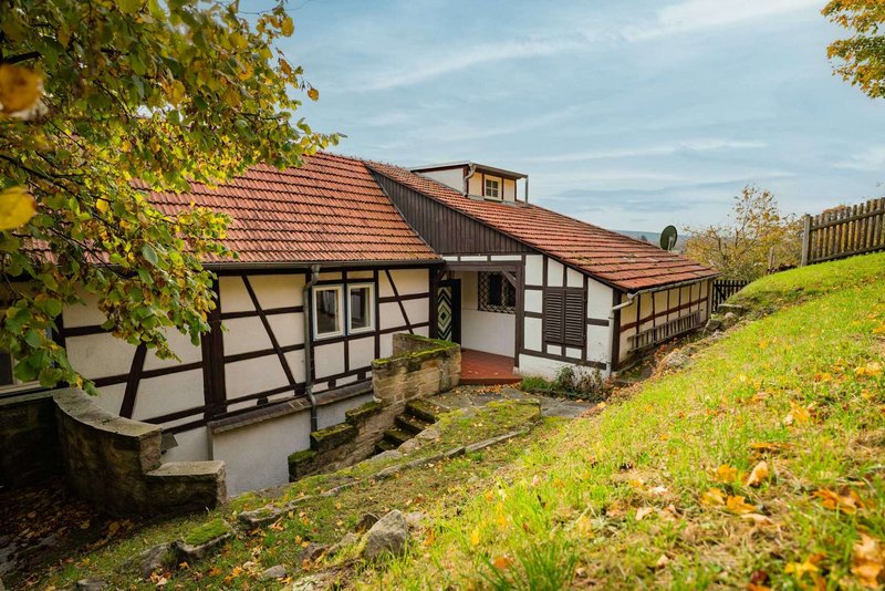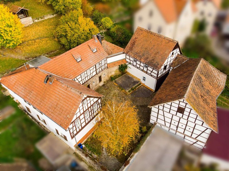 Eingebettet in die malerische Landschaft des Saaletals und das ruhige Dorf Zeutsch – das durch die Ortsumgehung in den letzten Jahren spürbar an Wohnqualität gewonnen hat – entfaltet sich dieses traditionelle Ensemble um einen geschützten Innenhof. Das zentral gelegene Fachwerkhaus, ergänzt durch zwei charaktervolle Nebengebäude, vermittelt ein harmonisches Gesamtbild. Besonders hervorzuheben ist der seltene Laubengang an einer der Scheunen, der dem Anwesen eine besondere architektonische Note verleiht.